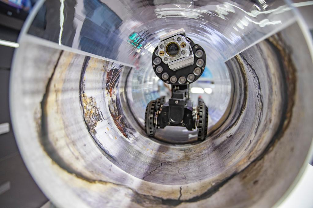 这是8月21日在2022智博会中央大厅重庆展馆内拍摄的非开挖管道检测机器人。