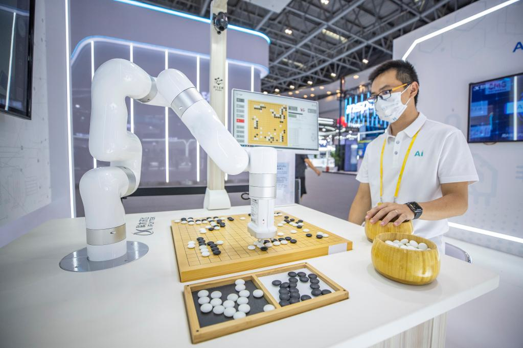 8月21日,2022智博会科大讯飞展厅的工作人员演示与弈棋机器人对弈。