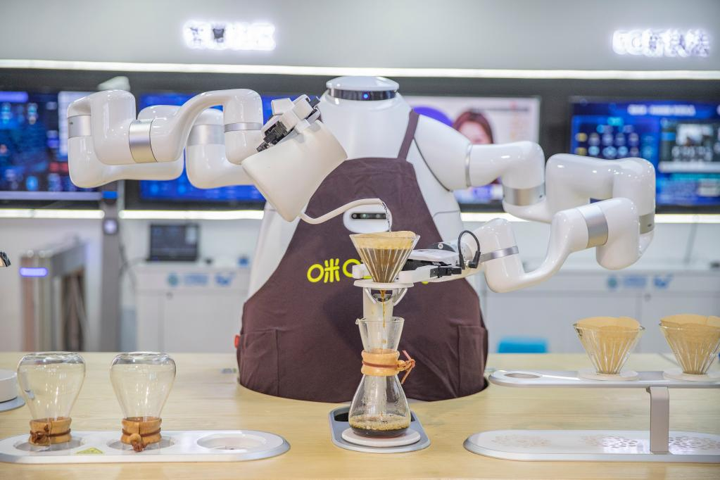8月21日,在2022智博会中国移动展厅内,智能机器人在制作咖啡。