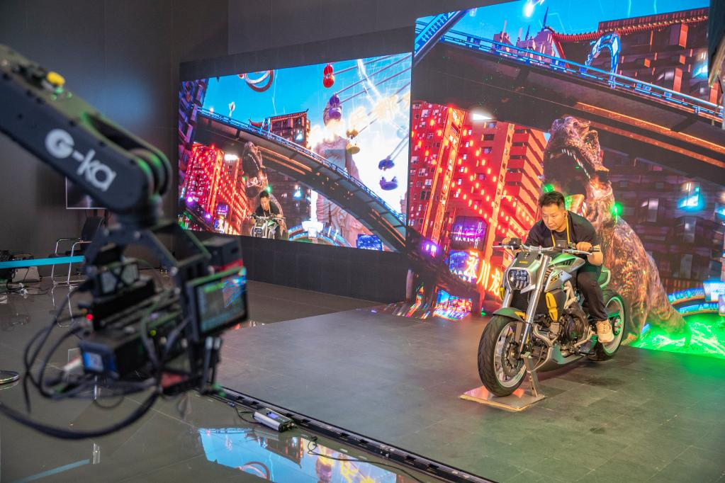 8月21日,在2022智博会重庆展馆内,工作人员在演示XR扩展现实拍摄技术。