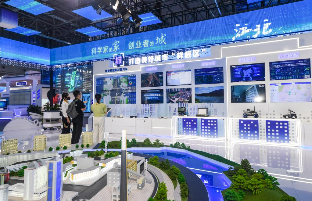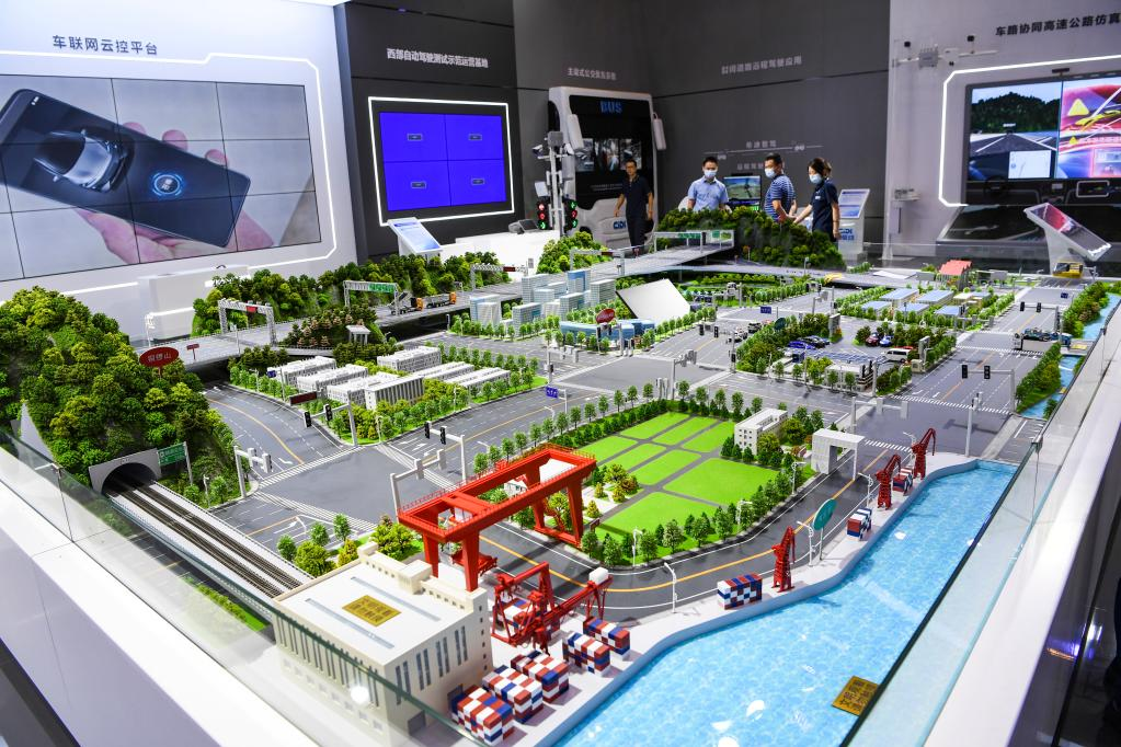 8月21日,嘉宾在2022中国国际智能产业博览会会场上参观车路协同沙盘。