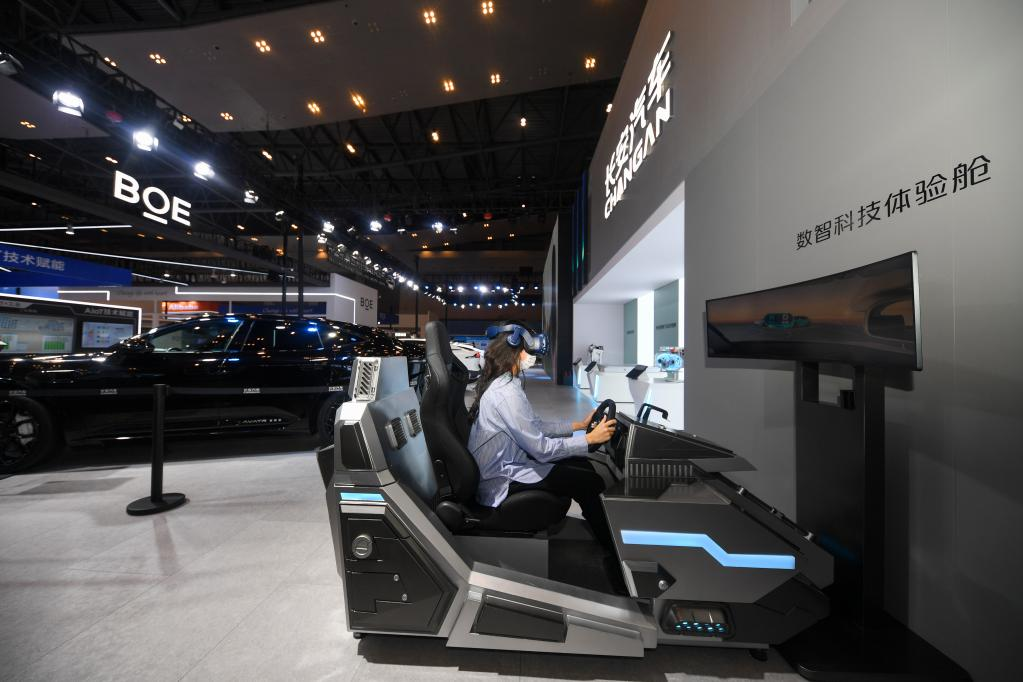 8月21日,媒体记者在2022中国国际智能产业博览会长安汽车展厅体验数智科技体验舱。