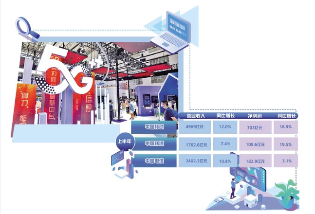 三家运营商保持增长态势为我国信息通信业发展注入强劲动能。工业和信息化部发布数据显示,今年上半年,电信业务收入累计完成8158亿元,同比增长8.3%;按照上年不变价计算的电信业务总量同比增长22.7%;5G和千兆光网等新型基础设施建设和应用加快推进,通信供给能力不断提升。