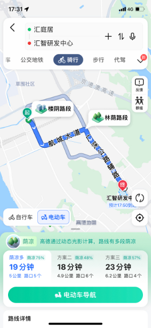 如今,当用户使用高德地图进行骑行或步行路线规划时,就能在APP中看到适时出现的、包含“林荫”和“楼阴”等多种路段的荫凉路线。