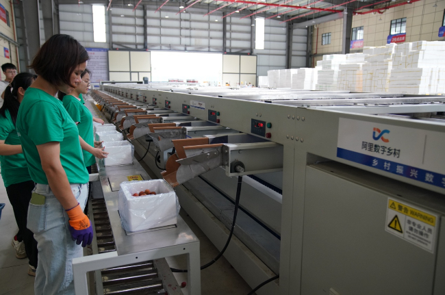 广西灵山智能产地仓工人正在数字化分选线旁等待荔枝进行打包