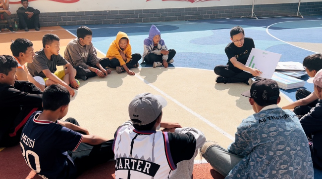 除运动场所外,操场也被设计为舞台、游戏场和美术课堂,通过配套的丰富玩具和文创产品,帮助孩子们健身益智,快乐成长,包括“姚基金”捐赠的篮球架,以及“山海情深”篮球服等。