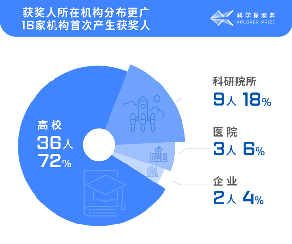 今年,“科学探索奖”获奖人来自18个城市和地区的35家不同机构,地域和机构分布都更广泛,其中16家机构首次有人获奖,西部省份获奖人数量有所提升,这些都是中国科技创新布局不断优化的写照。