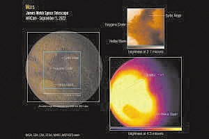 韦布发布的图像用两种不同的红外波长显示了火星东半球的图像。波长较短的部分是火星反射太阳光得到的结果,显示了可见光图像中常见的行星表面特征;波长较长的部分则显示了火星表面和大气散发的热量,以及大气中二氧化碳浓度的信息。