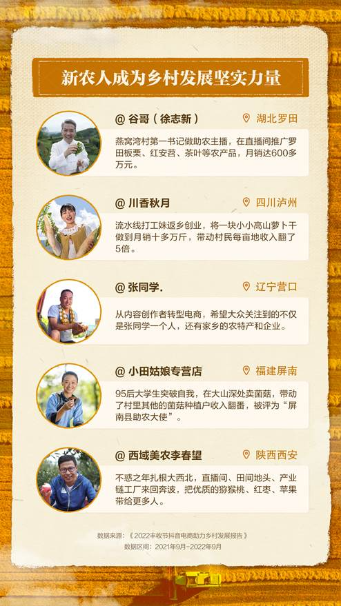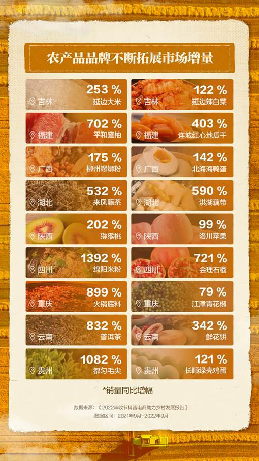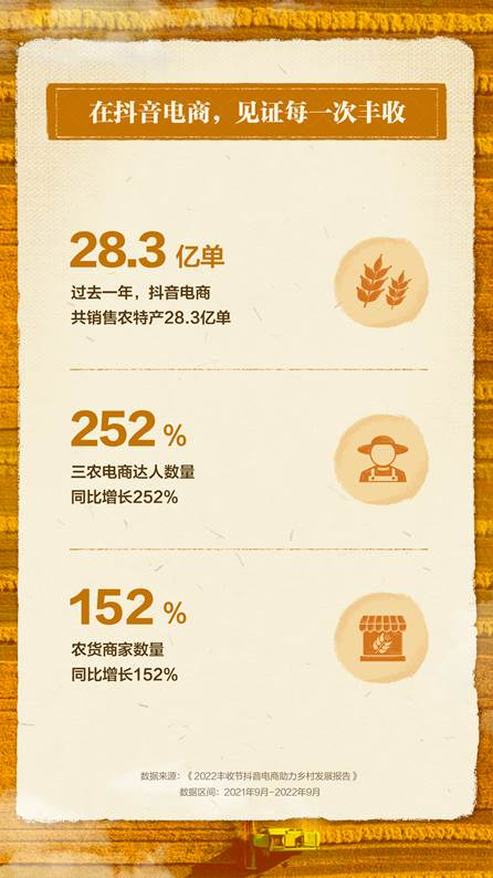 9月23日,抖音电商发布《2022丰收节抖音电商助力乡村发展报告》(以下简称“报告”)。报告显示,过去一年共有28.3亿单农特产通过抖音电商出村进城、卖向大江南北。该平台三农电商达人数量同比增长252%,农货商家数量同比增长152%,成为连接品质农特产和全国消费者的重要纽带。