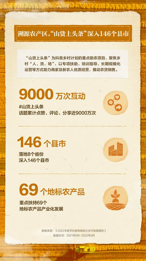 未来一年,抖音电商将通过“山货上头条”持续覆盖160个乡村振兴重点县域,深度助力100个山货助农产业发展。该项目还将重点扶持20个农产品区域公用品牌GMV破千万,200个地标农产品GMV达百万级。