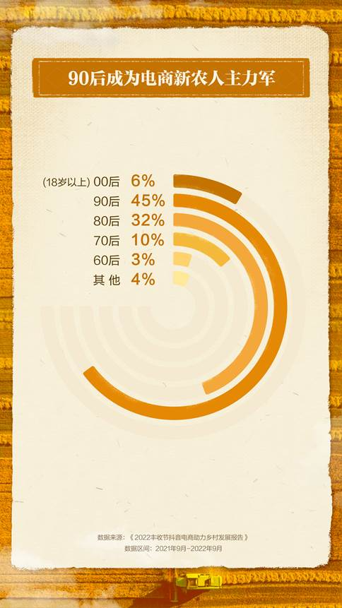 在农人们的共同努力下,品质农货的出村路被拓得更宽更广。报告显示,90后已经成为抖音电商三农带货达人里的主力军,占比达45%。80后和70后电商新农人占比分别为32%和10%。
