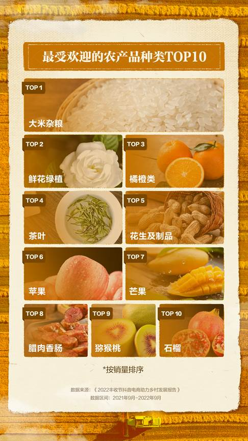 丰饶的物产受到了广泛关注与认可。在抖音电商,销量领先的农产品种类分别为大米杂粮、鲜花绿植、橘橙类、茶叶、花生及制品。此外,苹果、芒果、腊肉香肠、猕猴桃和石榴等产品也颇受欢迎。