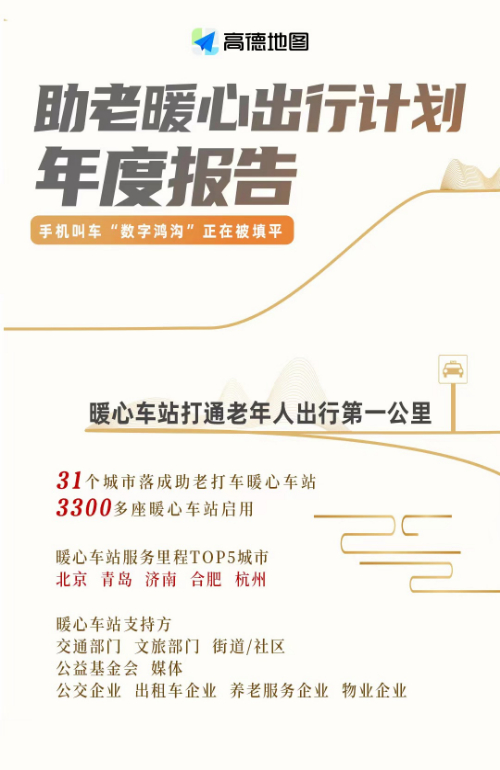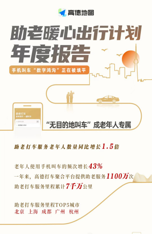 《助老暖心出行计划年度报告》显示,自去年10月助老暖心出行计划启动以来,高德打车聚合平台共提供助老打车服务1100万次,服务里程累计达到7000万公里,其中,累计服务里程最多的五个城市分别为北京、上海、成都、广州和杭州。