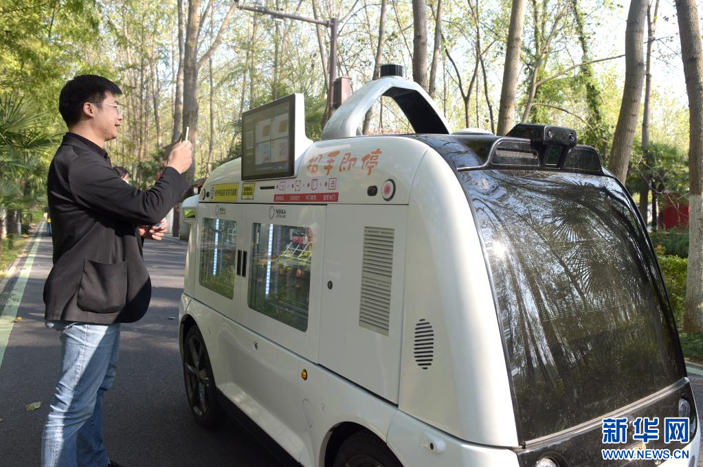 10月11日,在合肥滨湖国家森林公园,一名游客在无人售卖车前扫码购物。