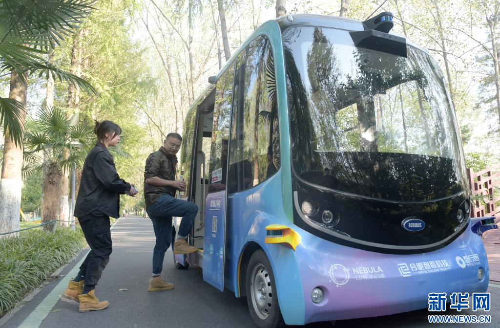 10月11日,在合肥滨湖国家森林公园,游客准备乘坐自动驾驶观光车。