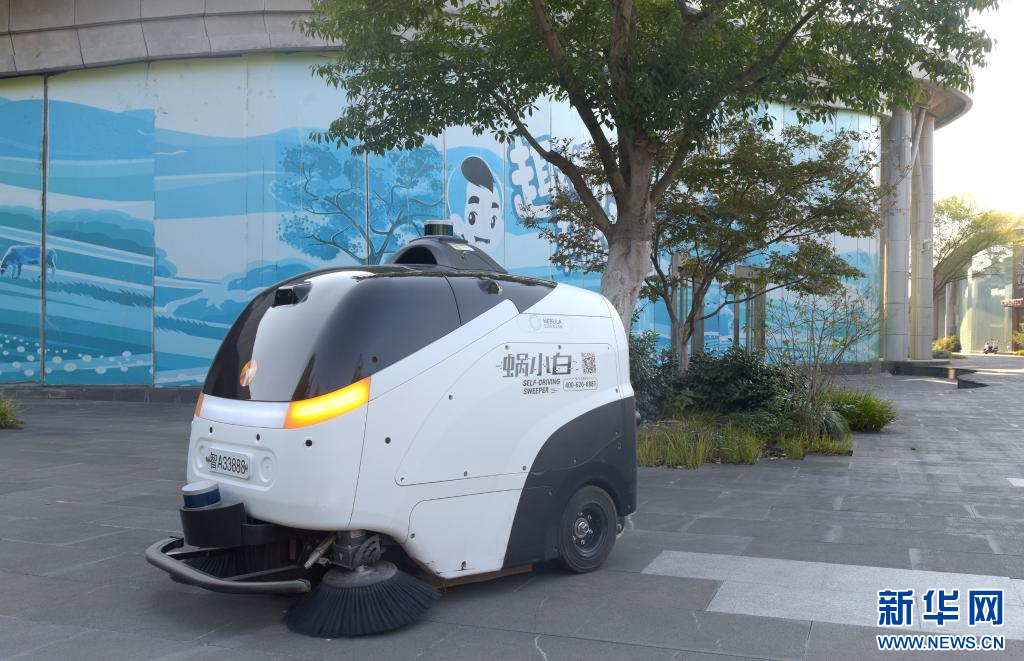 10月11日,合肥滨湖国家森林公园内的无人扫地车在清扫地面。