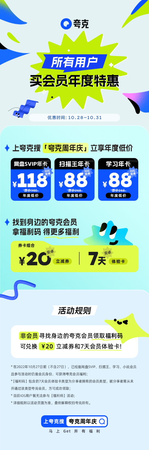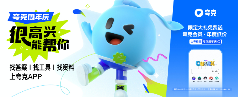 10月28日,夸克App以“很高兴能帮你”为主题,上线“夸克周年庆”活动,用户在10月28日-31日期间,购买夸克网盘、扫描王、学习以及组合年卡会员可享受全年最低价。