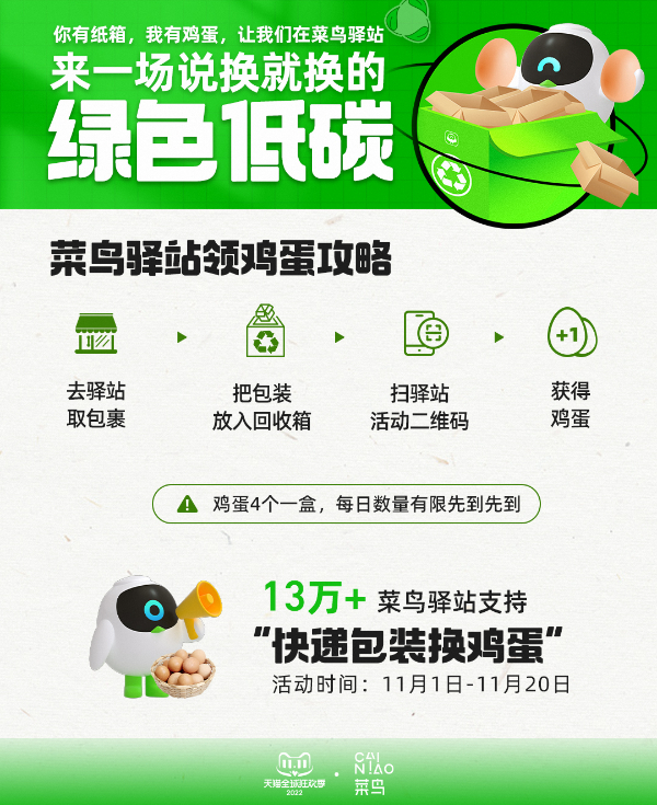 为了鼓励消费者参与绿色物流回收项目,今年菜鸟连续第二年开启“快递包装换蛋”行动。11月1日到20日期间,全国13万家菜鸟驿站均开放回收快递包装,消费者取件后将快递包装留下,再通过现场扫码,可在菜鸟APP绿色家园内领鸡蛋。