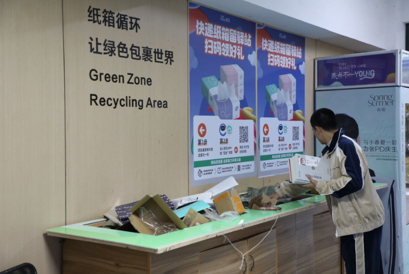 在菜鸟驿站内,消费者可以方便的参与快递包装绿色回收