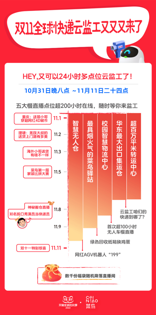 据了解,随着2022年天猫双11在10月31日八点的第一波开卖,菜鸟也将同步为天猫双11全球消费者带来快递“云监工”直播。这也是其连续第三年上线全球快递“云监工”,今年的直播时间从10月31日晚八点到11月11日二十四点,将第一次实现多屏同框互动,慢直播镜头和特色直播过程一起看。