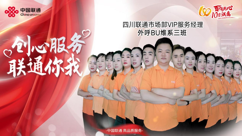 四川联通VIP服务经理-外呼BU维系三班,他们职守星级服务,本着客户为上,始终将“为客户提供最优质的服务”作为座右铭。他们坚信:热情、周到的服务一定能赢得客户的信赖。