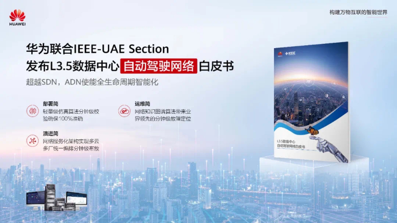 近日,在华为全联接大会2022迪拜站期间,华为联合IEEE-UAE Section面向全球发布《L3.5数据中心自动驾驶网络白皮书》(以下简称“白皮书”),阿联酋Ankabut和科威特CBK银行出席了发布仪式。白皮书详细阐述了在数据中心场景构建L3.5自动驾驶网络的架构和关键能力,典型应用场景以及面向金融、政府、能源等重点行业的部署实践,白皮书中提及的内容对企业提升数据中心网络的自动化和智能化水平极具参考价值。