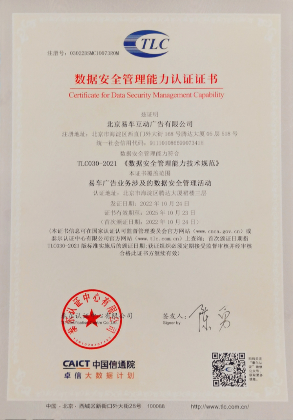 “数据安全管理能力认证(DSMC)”是由中国信通院联合认证机构面向全行业发起的数据安全领域权威国家级认证。易车作为汽车互联网头部企业,积极响应并落实数据安全保护工作,在信通院等相关部门的指导下,完成了机构人员构建、制度保障、数据分级分类等15项工作。逐步完善了数据安全管理能力框架建设、数据安全内部管理流程、技术等各方面的能力,并且达到认证要求。