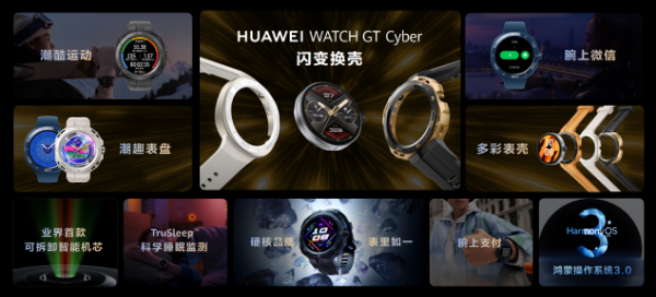 华为WATCH GT Cyber全新设计理念,打造闪变换壳手表,推出了可拆卸设计的智能机芯。全新的潮流外观,拥有六种表壳和六大专属主题,可切换不同场景。