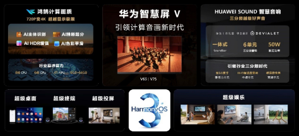 全新华为智慧屏 V 提供65英寸和75英寸两个尺寸,搭载鸿鹄计算画质,画面主体更清晰。画质层面,依托更新的CPU、GPU和NPU,以及华为神经网络模型算法,鸿鹄计算画质能够对画面主体进行智能识别和优化提升,让720P变4K,画面主体更清晰、更具立体感。华为智慧屏 V 采用HUAWEI SOUND与帝瓦雷联合设计的音响系统。搭载全新升级的HarmonyOS 3,拥有超级桌面、超级终端、超级投屏等一系列智慧化功能,聚合五大家庭娱乐场景。