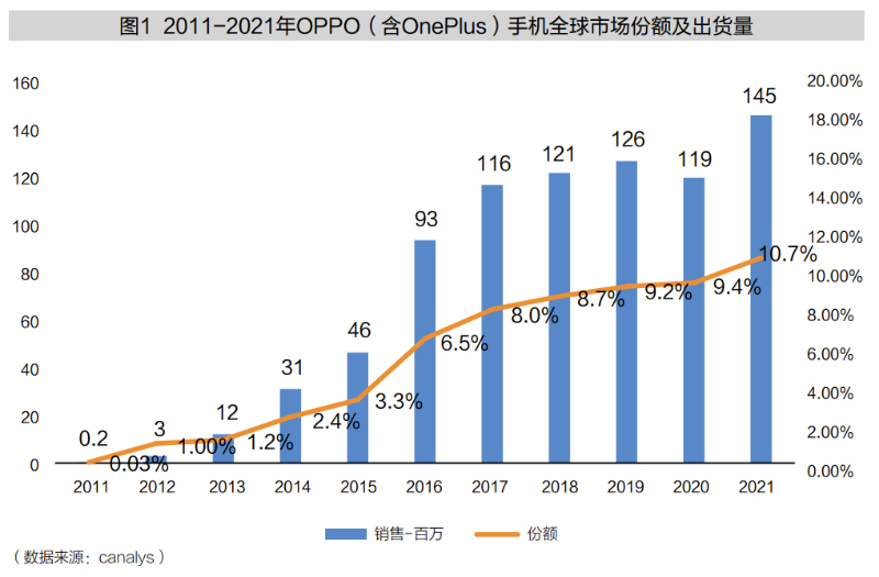 OPPO成立于2004年,创业之初的主要产品是MP3、MP4与DVD。2007年, OPPO进入手机市场,并先后于2008年推出第一款功能手机,2011年推出第一款智能手机。OPPO并不是手机市场上的“先行者”,而是一位“后来者”。在OPPO决定进入手机市场时,国内外的手机制造商已经开始了跑马圈地、群雄逐鹿。众所周知,智能手机市场的技术迭代速度快、市场环境高度动荡,这些都对手机制造企业的增长带来了极大的挑战。然而,OPPO却克服了这些挑战,在动荡的环境中获得了韧性增长。2021年,OPPO在全球的手机销售量达到了1.45亿部,占全球市场份额10.7%,位列全球第四,创造了智能手机发展史上的一个奇迹(图1)。