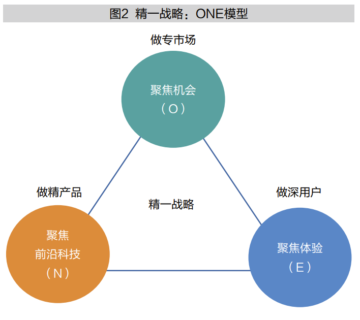 基于对OPPO战略模式的深入观察与研究,我发现“精一战略”包含三个维度:聚焦于机会(Opportunity),做专市场;聚焦于前沿科技(New-technology),做精产品;聚焦于体验(Experience),做深用户。我将这一模型称之为“精一战略”ONE模型(见图2)。
