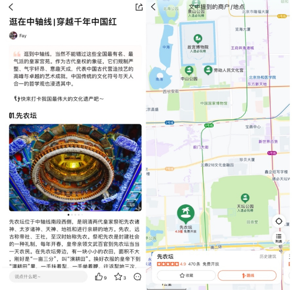 为激发更多市民体验中轴、助力申遗参与热度,大众点评笔记上线“中轴线特色专区”,以“吃”“逛”“骑”为版块主题,串联北京中轴线上的市井文化、民俗文化、皇家宫苑文化、传统商业文化,为市民分享中轴线美景,并推荐中轴线周边特色的餐厅与商号,通过丰富、多元的线上笔记内容带动消费者进店打卡。同时,还定制了三条中轴线美食骑行路线,沿途覆盖27个地标、47家特色餐厅,鼓励市民和游客用绿色出行的方式沿中轴线探访北京好去处。