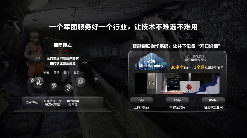 为了帮助企业选好技术、用好技术,另一个关键措施就是成立军团。自去年底,我们已面向煤矿、港口、电力等多个行业成立了多个军团组织。军团是专业化队伍,一方面,对内拉通端到端的资源,包括研发、销售、交付、服务等,以便深入理解行业的生产实践和行业知识,打造适配场景的产品和解决方案;另一方面,对外联合更多的解决方案伙伴,把华为和伙伴的能力整合在一起,形成针对性的解决方案。