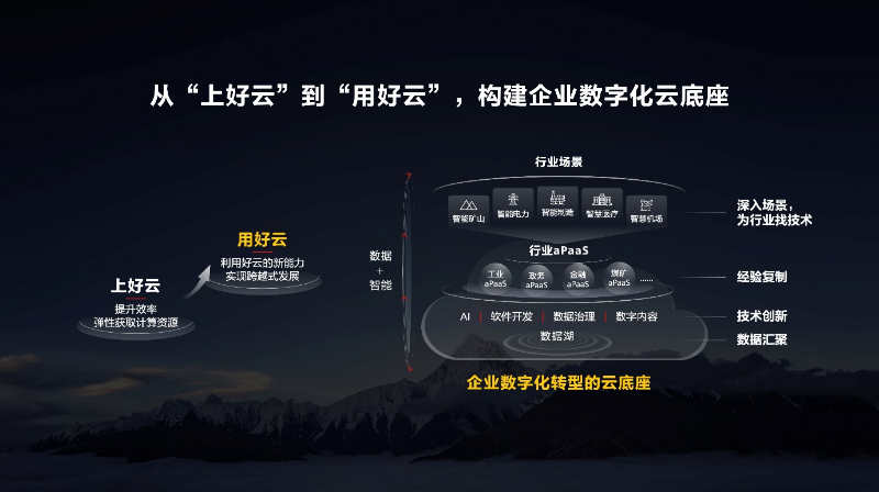 在当前阶段,很多企业更多地是利用云的基础设施服务,来获取弹性的计算资源。然而,云已经发展出了新能力,我们认为云服务的下一跳,是从“上好云”到“用好云”,即在云上获得业界最新的技术,在云上沉淀和复制经验,从而把企业数字化底座建立在云上。