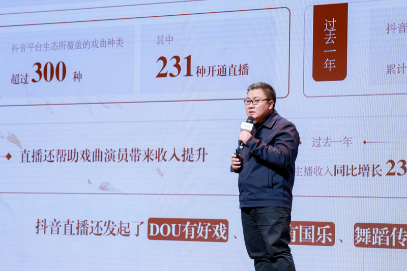 具体来看几个数据。截至2022年6月,抖音民乐直播覆盖超过87种乐器,累计开播311万场,观看人次超过61亿。这相当于每天有4270场直播,每场大概有2319人次。在戏曲内容方面,抖音直播覆盖了231个戏种。过去一年的数据显示,抖音戏曲直播超过80万场次,戏曲这类平均每场2300人次。这组数量非常之高,大家知道,一般线下演出规模大概是几百人。
