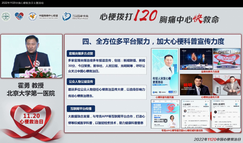 心梗救治日当天,由心血管健康联盟携手中国医师协会、中国胸痛中心联盟、苏州工业园区心血管健康研究院共同主办的“1120心梗救治日”活动上,北京大学第一医院心内科主任医师、中国胸痛中心专家委员会主任委员霍勇教授在其主题演讲“中国心梗救治日八年回顾 牢记【1120】”上,面向行业专家及患者,回顾了1120心梗救治日八年来的发展和多方支持的良好模式,并展示了心盟与夸克在心血管领域共建的科普词条及专题活动,呼吁公众加强对急性心梗认知。