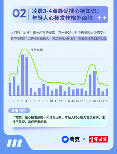 数据显示,在搜索心梗的用户中,18到24岁的年轻人占比最高,每天凌晨3点搜索心梗的需求量最大。在心梗相关知识中,“心梗前有哪些症状”、“发生心梗如何急救”与“如何预防心梗”最受用户关注。