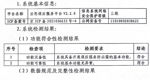 教育部教育管理信息中心近日对吉林省珲春市采用的云思智学课后服务平台系统“云思课后服务平台V2.2.0”开展检测,内容包括资料审核、功能符合性、数据规范及完整性、数据传输安全性等。检测结果显示,云思课后服务平台符合对接标准要求,具备与国家统一平台实现数据对接的能力,能够有效支撑学校开展课后服务工作。且针对该系统的检测报告具备普适性,同版本系统可直接启动数据对接工作,无需进行重复检测。