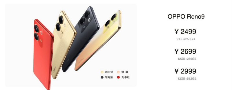 在价格上,OPPO Reno9系列提供Reno9 Pro+、Reno9 Pro与Reno9三个版本。OPPO Reno9 Pro+提供明日金、皓月黑、碧海青三种配色,16GB+256GB版本售价3999元,16GB+512GB版本售价4399元;OPPO Reno9 Pro提供明日金、皓月黑、微醺三种配色,16GB+256GB版本售价3499元,16GB+512GB版本售价3799元;OPPO Reno9同样提供明日金、皓月黑、微醺三种配色,8GB+256GB版本售价2499元,12GB+256GB版本售价2699元,12GB+512GB版本售价2999元。OPPO Reno9系列新品将于12月2日正式发售,“万事红”配色将于12月10日发售。