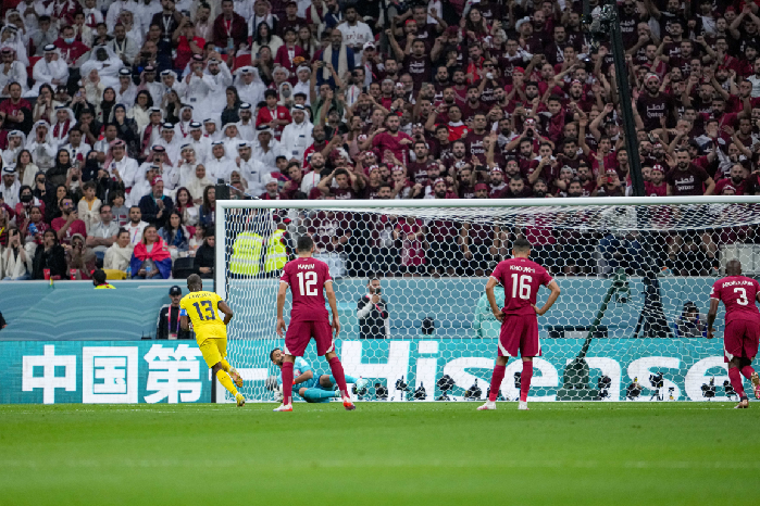 厄瓜多尔队球员恩纳·瓦伦西亚(左一)打入点球瞬间