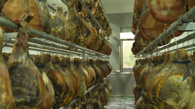 发酵间内,一排排火红的“琵琶”悬吊于晾挂架上,接受着时间洗礼。浓厚的咸香味氤氲整个房间,工人们穿梭其中并不时翻动,通过观察霉菌颜色来判断火腿的发酵程度。