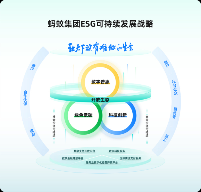 作为一家从支付工具起步的互联网平台,蚂蚁一方面立足自身,帮助小微企业降低经营成本、获得普惠金融服务,同时也应该承担起平台的责任,开放平台的技术与能力,与社会各界、利益相关方合力,帮助广大小微企业提升数字化转型、绿色转型的活力,共建更可持续的生态。