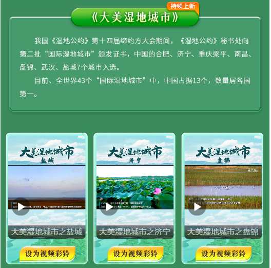 在《湿地公约》第十四届缔约方大会期间,我国共有7个城市入选第二批“国际湿地城市”。在此次中国联通“湿地之美”主题系列视频彩铃中,依次选取了13个中国“国际湿地城市”与用户一起领略湿地城市之美。