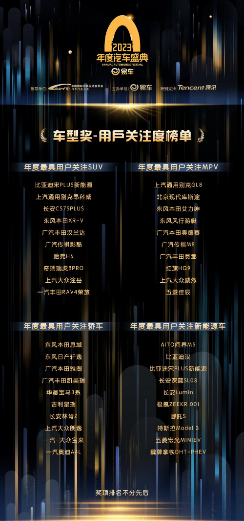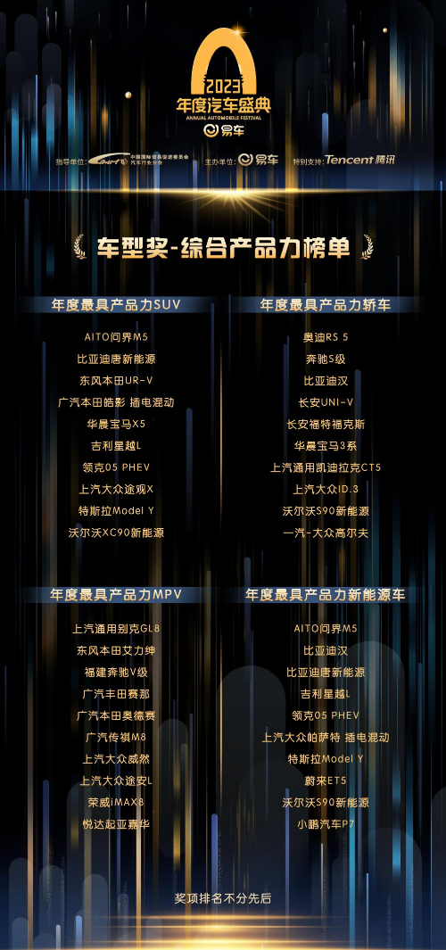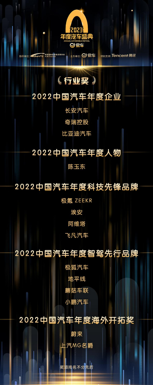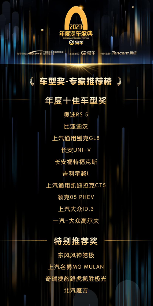 12月16日,由易车主办,中国国际贸易促进委员会汽车行业分会指导,腾讯特别支持的2023易车年度汽车盛典于线上举办。在专家顾问评审团、行业嘉宾等共同的评选与见证下,多项车市大奖揭晓。