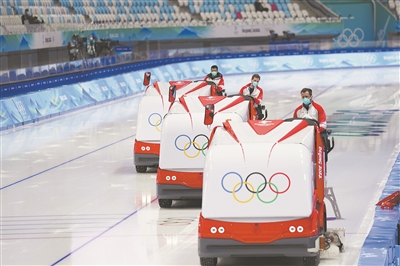 2月8日,全世界最大的二氧化碳跨临界直冷制冰系统在北京国家速滑馆内运用,该系统可提升能效20%以上,使冰表面温差不超过0.5℃。视觉中国供图