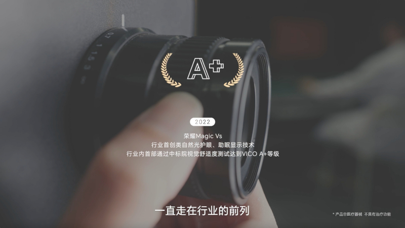 同时最新发布的荣耀Magic Vs,成为手机行业通过中标院VICO A+舒适性认证的产品,搭载类自然光护眼功能,它能模拟自然光的动态变化,在稳定光环境下,智能采用律动光技术。这有助于保证部分眼部肌肉适度运动、促进眼部血液循环,从而缓解眼疲劳。荣耀Magic Vs助眠显示功能充分参考人体的原始作息节律,从日落开始缓慢下调屏幕色温,实现无感知降低蓝光,在夜间使用荣耀Magic Vs系列3小时,较使用无此功能的产品,被试者褪黑素浓度平均高出约20%。