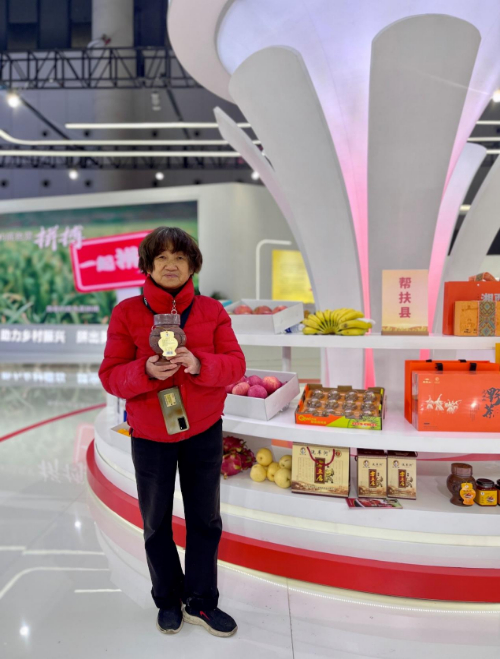 今年71岁、来自湖南省龙山县的霉豆腐非遗传承人刘金霞,带着特色产品亮相农交会拼多多展台