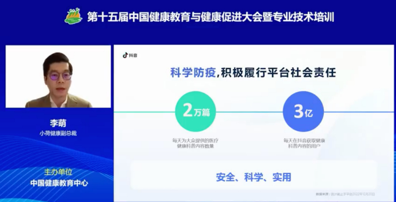 12月28日-29日,由国家卫生健康委中国健康教育中心主办的第15届中国健康促进大会在线上召开,抖音在大会上作健康科普和传播等相关报告,介绍了2023年的科研合作项目内容,包括形成《健康科普短视频行业科普行为指南》,共建医疗短视频科普标准等。
