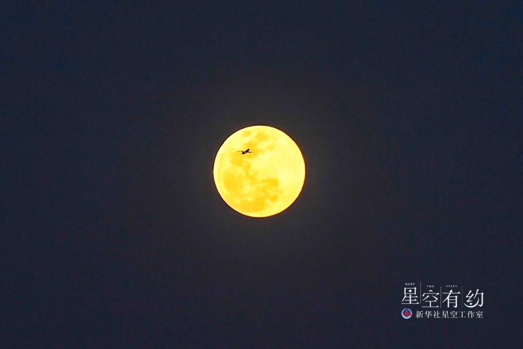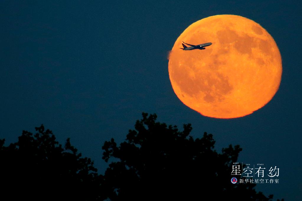 这是2015年7月31日在美国泽西城拍摄的一架飞机从“蓝月亮”前飞过。新华社/美联