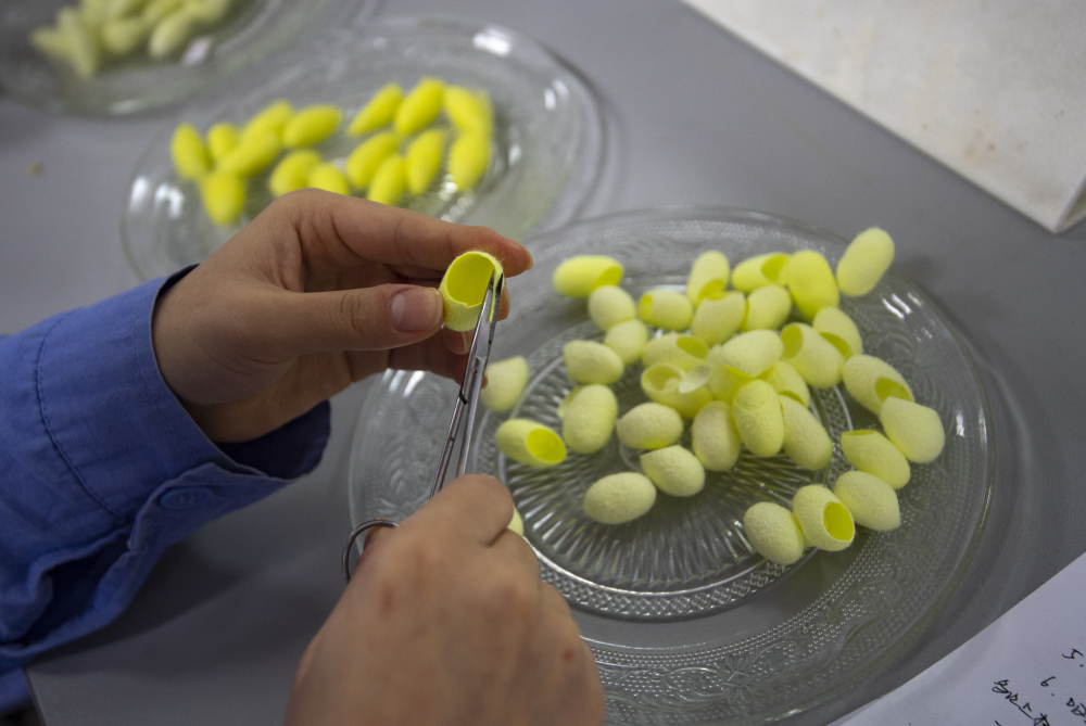 图为实验室中供科研使用的天然绿茧。(受访者供图)